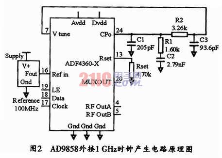 AD9858的外接1 GHz时钟点频源可使用ADF4360_2生成,并可使用ADIsimPLL仿真,其基本电路原理图如图2所示。ADF4360_2的参考时钟使用100MHz有源晶振,实际电路设计时需加入滤波后再接到Ref端口。输出频率为2 GHz,可以设置为2分频输出,也可以在AD9858芯片内部设置为2分频输入。