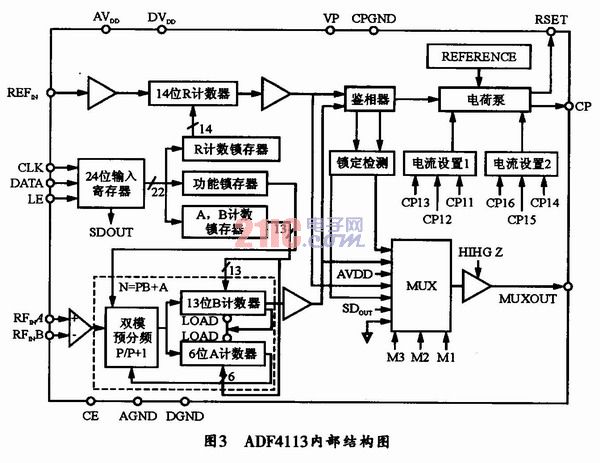 PLL模块包括ADF4113和输出带宽为1~2 GHz压控振荡器。ADF4113的内部结构如图3所示,它由低噪声数字鉴相器、高精度电荷泵、可编程参考分频器(R分频器)、可编程A,B计数器以及双模分频器P/P+1组成。其中6位A计数器、13位B计数器与双模分频器共同组成了N分频器,分频比为N=BP+A。数字鉴相器用来对R计数器和N计数器的输出相位进行比较,然后输出一个与二者相位误差成正比的误差电压。该电压经外部滤波器滤波后可控制外接VCO,从而构成一个完整的频率合成器。其输出频率为: