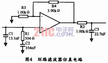 环路滤波器是锁相环电路中很重要的一个部分,它的性能好坏直接关系到锁相输出的相位噪声和杂散指标。设计时仍然可使用AD公司提供的PLL仿真软件ADLsimPLL来生成。其各项参数设置为:输出频率为1~2 GHz。鉴相频率为5 MHz,使用有源滤波,放大器输出电压范围为-15~+15V。该设置可以满足后级电路VCO的控制要求。其环路滤波器仿真电路如图4所示。