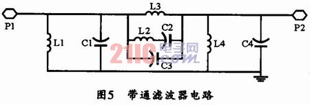 带通滤波器的设计方案直接影响到输出信号的质量。DDS输出信号中含有丰富的高频成份,考虑到电路规模和系统要求,本文采用常用的椭圆滤波方案,并使用三阶滤波器滤除杂散。同时使用ADS滤波器辅助设计,其具体电路如图5所示。其中,L1和L4为41 nH;Cl和C4为137 pF;L2选52 nH;L3选54 nH;C2选108 pF;C3选103 pF。