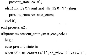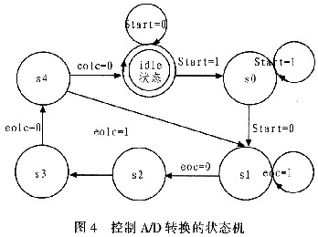 根据控制存储的要求,首先要设计控制A/D转换的状态机,用来确定A/D转换的状态,根据MAXl308工作时序特点而设计的控制A/D转换的状态机转换图如图4所示。实现控制A/D转换的状态机部分主要VHDL程序源代码如下: