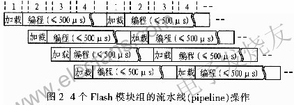 如图2所示是4个Flash模块组采用流水线(pipeline)操作,使用该方式可以克服Flash写入速度较慢的缺点。Flash存储器的写入有2个阶段:数据加载阶段(通过I/0端口将数据写入页寄存器)和编程阶段(在芯片内部,将页寄存器的数据传输到存储单元)。由于编程阶段是自动进行的,不需要外部系统的干预,控制器可以进行其他事务的处理,如有效块地址的运算等,从而节省系统开销。NAND型Flash存储器的写操作以流水线方式进行,首先加载第1个Flash模块组,数据加载完后,第1个模块组进入自动编程阶段:再加载第2个Flash模块组,数据加载完后,第2个模块组进入自动编程阶段;然后依次对第3个乃至第4个模块组进行操作,当第4个模块组数据加载完后,第1个存储模块组已经自动编程结束,接着再加载和自动编程形成流水线的工作方式。从整个系统总体效果来看,它一直在进行存储加载数据。