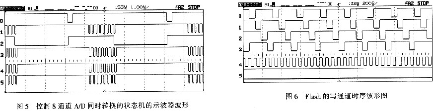 将程序下载至CPLD中运行调试,经过对电路的调试和测量,控制8通道A/D同时转换的状态机产生的示波器时序波形如图5所示,其中,0、1、2、3、4分别对应的是图3中的CONVST、EOC、EOLC、CS、RD,而第5通道是对FIF0的写信号。从示波器显示的波形图可以看出产生的8个连续的脉冲对应位置完全满足图3所要求的时序要求,也就是说在控制器同时控制8路信号的采集时不会出现时序混乱的情况。由此可知,采用本系统中设计的采集程序可以实现同时采集的要求,并且根据采集的脉冲宽度分析可知该系统能满足采集速度为10 Mb/s的设计要求。