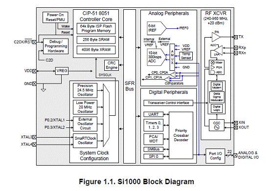 Si10xx系列产品在5mm×7mm大小的封装内,集成了高性能、超低功耗的CIP-51TM内核8位单片机C8051F9XX以及Silicon Labs固有的 EZRadioPRO 系列RF收发器,仅需要少量外围元件及PCB面积就能组成高性能无线收发系统。其MCU包含高达25MIPS的处理器,64kB的Flash,低功耗电源处理模块,丰富的数字外设如SPI、SMBUS、UART总线,PCA输出阵列,多组定时器,以及模拟外设如具有300KSPS采样速度的10位ADC模块、温度传感器、比较器等等。而RF部分最高20DBM的发射功率,-121DBm的灵敏度,使系统拥有了高达的141DB 链路预算,从而达到了比同类产品几倍的有效工作距离。可以说,Si10xx系列产品提供了目前业界最高性能的单芯片无线MCU解决方案。