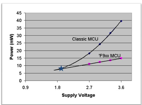 在正常工作模式下,在F,C恒定时,我们给MCU供电电压是电池电压一半,此时功耗为市面上典型的其他低功耗MCU四分之一,除去DC-DC(效率比竞争对手效高25%)和LDO 上小部分功率消耗,总功率消耗比市面上的低功耗MCU 还要低很多,大大延长电池寿命,电池成本减少到原来的五分之一,而且MCU处于恒定供电电压,在休眠状态下,DC-DC能被关掉!以下为供电示意图和市面上典型低功耗MCU功耗对比图。