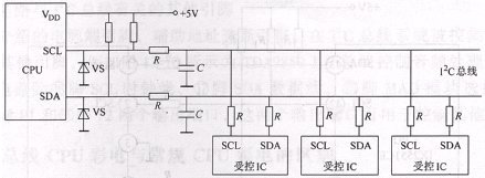 直接式I2C总线是指被控集成电路直接或通过电阻挂在I2C总线上,其电路工作原理图如图4所示。因为CPU的I2C总线输出端口内部电路形式为集电极开路(或漏极开路)形式,所以在CPU的I2C总线输出端必须通过上拉电阻R接+5V电源,为CPU的I2C总线输出端口的内部电路供电。图4中的电阻R为隔离电阻,C为抗干扰电容,主要是为了提高I2C总线上数据传输的可靠性,防止误动作进人维修状态和防止由于外部干扰信号改变I2C总线数据。稳压管VS是为了防止外部高电压损坏CPU的I2C总线输出端的内部电路。