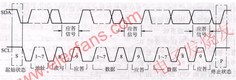 数据线上传输的控制信号,均按图3所示的内容和顺序先后传输:起始状态信号、被控电路地址、读写方式(数据传输方向位)、应答信号、数据信号、应答信号、数据信号、应答信号、终止状态信号。