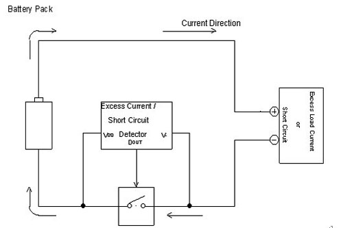 因不明原因导致短路而有大电流耗损时,为确保安全而使之停止放电。在过电流的侦测是以Power MOS的Rds(on)为感应阻抗,以监视其电压的下降,此时的电压若比过电流侦测电压还高时即停止放电。为了使Power MOS的Rds(on)在充电电流与放电电流时有效的应用,需使该阻抗值尽量低,(目前约20mΩ ~30mΩ )。如此,过电流侦测电压就可较低。