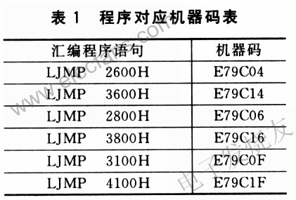 上述语句实际上代表的是LJMP2600H.其机器码为E79C04,当地址2600H变化时,得到一组对应的机器码,通过对这一组机器码进行分析,就可以得到该方法的原理,如表1所列。