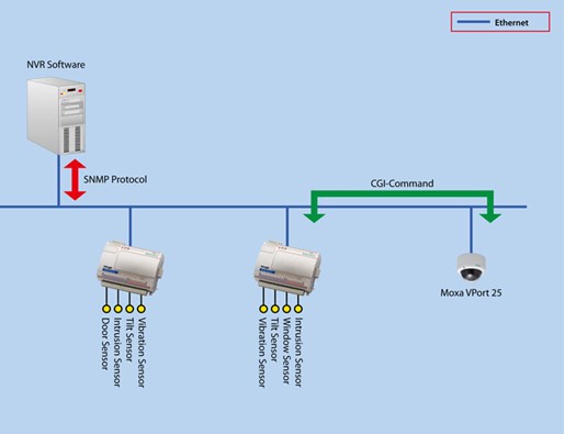 Moxa主动式以太网I/O解决方案支持发送用户自定义的CGI命令,这是网络视频监控中的常用协议。有了这个功能,ioLogik E2200系列可以很容易连接IP摄像头,启动警报器或将摄像头转至预先设定的观察点。
