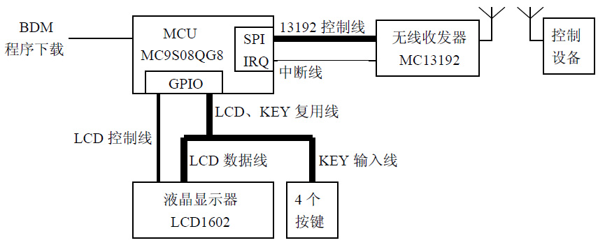 微控制器MC9S08QG8通过通用I/O接口GPIO完成与液晶显示器和按键的连接,其中LCD数据线和按键输入线设计成多路分时复用的(共4线),LCD的控制线由MCU单独提供(共3线)。