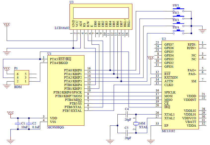 通常的ZigBee无线控制器节点是以一个高端微控制器为核心,再配合无线收发器构成的。本文将设计一个新型的、低成本的、使用ZigBee无线技术的精简型无线控制器,比如用于空调遥控,整个目标应用板上的元器件极少,走线极少,体积极小。该设计只采用三个电子芯片:一个低端微控制器(MC9S08QG8)、一个RF收发器(MC13192)和一个16×2的LCD,其他需要的元器件为电阻和按键之类的无源器件。