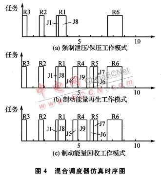 图4(a)说明了当HBRS电子控制系统在强制泄压和保压工作模式时处理器执行任务的时序。此时,处理器根据任务R3和R2采集的车辆工作状态信息,经任务R1判断系统的工作模式,若为强制泄压或保压工作模式则执行任务R6发出控制命令。