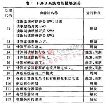 功能模块是实时系统的基础研究对象,并且相关联的功能模块组成1个系统任务。在本文研究的液压式制动能量再生控制系统中,共有13个功能模块,如表1所列。表中周期功能模块相对时间轴周期性运行,触发模块只有在制动能量再生和制动能量回收工作模式中运行。