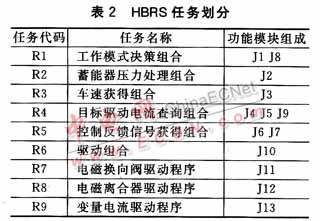 根据任务划分原则为I/O依赖性、功能内聚、任务内敛,将13功能模块划分为6个任务,如表2所列。9个任务中R1~R6由系统控制处理器芯片调度实现,R7~R9由微控制器集成外设控制。J10和J11由芯片TLE6230GP实现驱动,J12则由控制芯片的PCA及扩展芯片33486A实现,并由单片机PCA模块实现PWM信号输出。