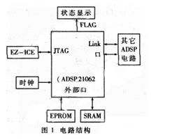 我们应用ADSP21062处理器设计了一个雷达信号处理系统。此系统可以独立地进行工作,也可通过Link口与其它DSP进行通信。ADSP21062利用JTAG接口与EZ-ICE仿真器连接,实现对系统的仿真和测试。系统的电路结构见图1。