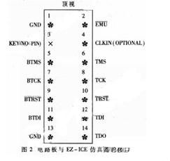 EZ-ICE仿真器应用IEEE1149.1 JTAG测试标准,监视和控制目标板处理器的工作。EZ-ICE仿真器的测试头通过一个14针的连接头与目标板处理器的CLKIN (可选)、TMS、TCK、TRST、TDI、TDO、和GND信号相连。在电路板上设计了一个14针的接口,其信号的接口如图2所示。