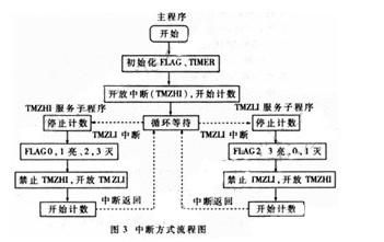 设计一个对FLAG位的四个指示灯的操作,让其交替地闪烁,来检验ADSP21062处理器是否能够正常运行。程序采用中断方式,利用定时器溢出时产生两个中断TMZHI和TMZLI。一个中断的服务程序设置FLAG0,1的指示灯亮,FLAG2 3的指示灯灭;另一个中断服务程序设置情况相反。两个服务程序交替执行,交替的间隔由定时器的初值确定。程序流程图见图3。