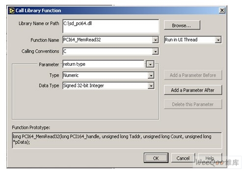 分别对DLLs文件名称及存放路径,函数调用方式,需要调用的目标函数的名称,参数个数,每个参数的类型,数据类型及返回值类型进行设置。设置完成后单击“OK”返回LabVIEW 的设计面板(diagram)中。此时,Call Library Function已经根据刚才配置好的参数个数和类型设置好了输人输出端口,和其它的LabVIEW节点图标一样,只需要将其对应的参数连线即可。