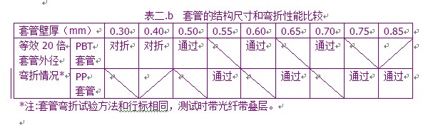 两种不同材质的套管在诸多文献中已有大量的描述,其主要比较结果为:假设结构设计完全相同,PBT套管会具有更好的拉伸机械强度、耐冲击性能、抗弯曲强度和耐压扁强度,但对弯折半径比较敏感。非改性PP的耐热氧老化性能较差,PBT在高温湿热条件下,存在较严重的水解反应。