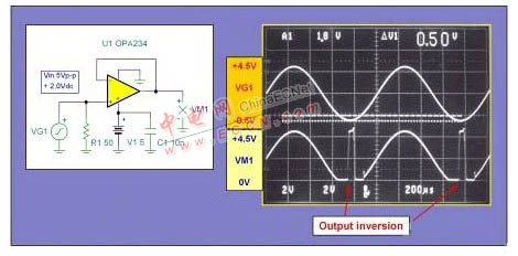 图 6 输入转换期间输入到输入的应力图中翻译:(右上)输入-输出压差(input-output voltage difference)在图 6 所示的转换时间内,在输出达到输入脉冲峰值要求的时间期间存在一个较大的输入到输出电压差。一开始,放大器输入端和输出端之间的压差为 10V。放大器转换至其最终水平后该压差随之降低。由于反相输入一开始便具有与输出相同的电位,因此在两个输入端之间存在 10V 压差。若运算放大器不包括内部输入到输入钳位功能,则破坏性电压电平可能会被施加到输入晶体管的开云棋牌官网在线客服结点上。这是双极输入运算放大器更为严重的一个问题。当前的现代双极输入运算放大器差不多都包括保护钳位电路。一些运算放大器会呈现出输出反向特性,其伴随着输入过驱动(请参见图 7)。这种现象一般被称为输出相位反向。大多数现代运算放大器都不会出现这种现象,但也有一些运算放大器会出人意料地存在这一现象。对于那些具有这种特性的运算放大器来说,一般只有当施加的输入电平超出产品规定的共模电压 (CMV) 范围时才会发生。当运算放大器出现输出相位反向时,需采取预防措施来防止输入被过驱动。