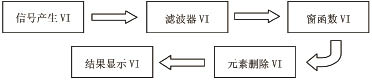 按图3.1分别设计各个子VI(图3.3)。从LabVIEW函数面板取出波形生成函数并与信号生成控件和采样参数控件连接起来构成信号产生VI。将设计好的滤波器子VI跟滤波方式及参数控件连接构成滤波器VI。窗函数子VI跟窗函数选择控件连接构成窗函数VI。最后将信号连接至元素删除VI经波形图显示控件显示。
