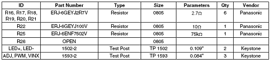 Initially the output current is set at the minimum of approximately 4A with the POT P1 fully counter-clockwise. To set the desired current level a short may be connected between LED + and LED-, then use a current probe and turn the POT clockwise until the desired current is reached. PWM dimming FETs are included on-board for testing when the LED can be connected directly next to the board. A shutdown test post on J2, ENA, is included so that startup and shutdown functions can be tested using an external voltage.