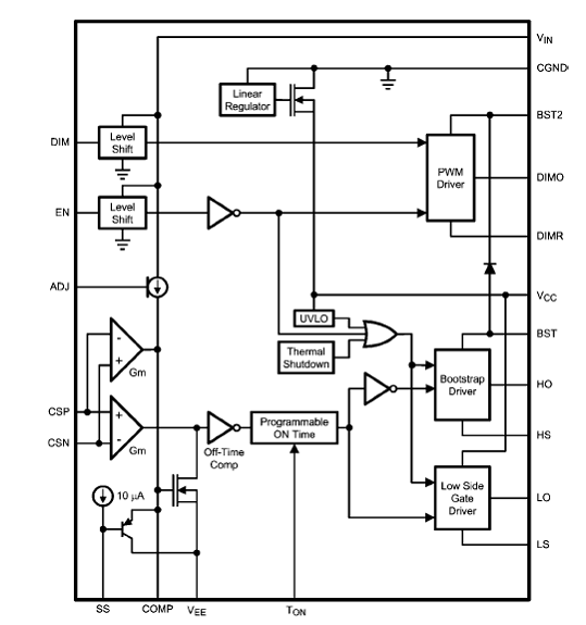 The other input is a logic level PWM control of LED current. The PWM functions by shorting out the LED with a parallel switch allowing high PWM dimming frequencies. High