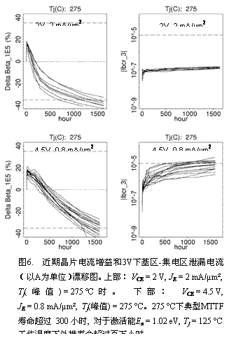 可靠性通过对分立的自对准1 × 3 µm² 漂移是主要的可靠性失效模式。利用测试得到的激活能Ea, 其值大约为1.02 eV, 外推得到Tj =)bHBTs进行高温寿命测试(HTOL)来确定,电流增益( 125 °C.温度下MTTFs 寿命超过106 的下半部显示双异质结双极晶体管结构(例如,InP集电区)可在VCE6以上。图03值始终保持在 b,这一标准保证了6作为失效标准同样示于图 %5漂移 b。以电流增益6集电区电流泄漏(位列第二的主要可靠性失效模式)示于图漂移和基区 )b小时。电流增益( = 4.5 V 下保持高可靠性工作,这一电压值比InP衬底单异质结双极晶体管高出 2 3 V。