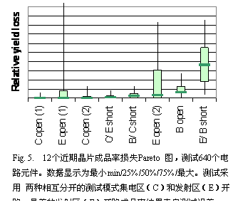 工艺的设计考虑到性能、可靠性和可生产性之间的平衡。从成品率损失Pareto 图 Fig. 5 中可以看出发射区/基区短路是影响成品率的主要原因,基区电极柱损失是影响远小于发射区/基区短路的第二个原因。影响成品率的其它失效模式的影响相对较小,都在测试不确定范围内。由500个晶体管组成的典型电路所达到的成品率已能够满足小规模仪器的应用应用。