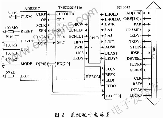 该模块采用高性能的TI公司的TMS320C6416DSP芯片负责数据的采集和处理。TMS320C6416是目前能力最强大的处理器(DSP),它的主频高达600 MHz,内部包括1个DSP内核、一级数据Cache、一级程序Cache、二级存储器、增强型DMA控制器(EDMA)、Vterbi译码协处理器(VCP)、T-urbo译码协处理器(TCP);对外接口包括2个外部存储器接口(EMIFA和EMIFB)、主机接口(HPI)、PCI接口、UTOPIA接口、多通道缓冲串口(McB-SP)。