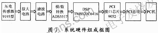 基于TMS320C6416动态称重系统的硬件设计主要包括:压电石英式传感器、放大电路模块、滤波电路模块、模/数转换模块、TMS320C6416信号处理模块、存储器模块、PCI接口模块、电源电路模块组成,其组成框图如图1所示。