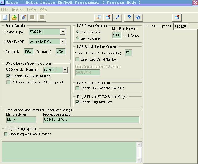 由于是专用的USB转串口,FT232需要重新配制VID 和PID 以及设备描述信息,EERPOM的配制可用专用的EERPOM烧写工具,也可用MProg3.0_Setup.exe+配制文件.ept文件来配制,方法如下