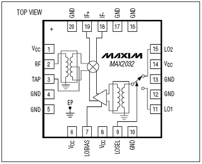 The MAX2032 is available in a compact 20-pin thin QFN package (5mm x 5mm) with an exposed pad. Electrical performance is guaranteed over the extended -40℃ to +85℃ temperature range.