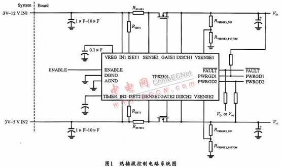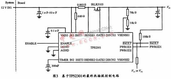 根据上述分析,最终得到的基于TPS2301芯片的热插拔控制电路如图3所示。