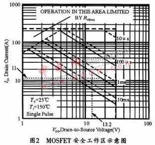选择合适的MOSFET的第一步是选定VDS和ID标准。对于12 V系统来说,VDS应为30 V或40V,这样可以处理可能损坏MOSFET的瞬变。MOSFET的ID应远大于所需的最大值,图2所示是MOSFET的SOA图。事实上,在大电流应用中,最重要的指标之一是MOSFET的导通电阻RDSON。较小的RDSON能确保MOSFET在正常工作时具有较小的功耗,并在满负载条件下产生最少的热量。