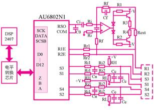 au6802n1外围主电路包括激励调理电路、反馈滤波调理电路和dsp接口电路。电路图如图4所示。