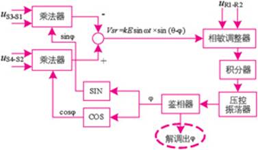 其中,ω为激磁电源的角频率;us4-s2,us3-s1为两相正交绕组(正弦绕组和余弦绕组)的输出电压。k为传输电压比,θ为转子位置角。