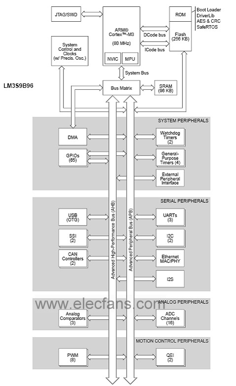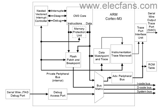 图2.Stellaris LM3S9B96 Cortex-M3处理器方框图