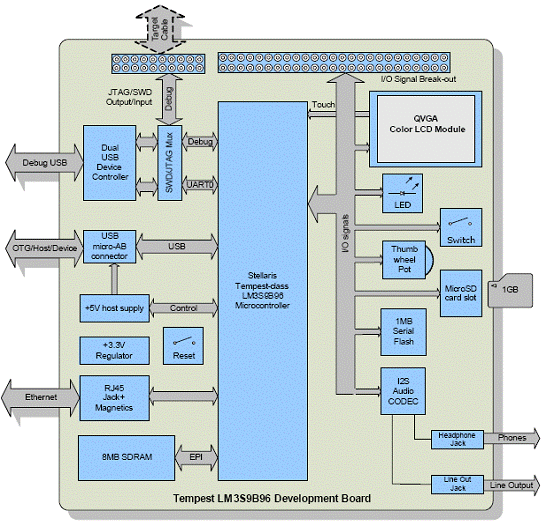 The LM3S9B96 is a member of the Stellaris Tempest-class microcontroller family. Tempest-class devices include capabilities such as 80 MHz clock speeds, an External Peripheral Interface (EPI) and Audio I2S interfaces. In addition to new hardware to support these features, the DK-LM3S9B96 board includes a rich set of peripherals found on other Stellaris boards.