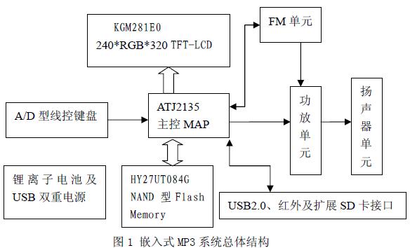 播放器核心是炬力的ATJ2135芯片,主要组成包括电源单元、显示单元、键盘输入电路、FM收音机单元、外部存储器、功放及扬声器单元等。系统总体框图如图1。主控MAP中的嵌入式DSP对MP3文件进行音频解码,解码后的序列经MAP中DAC输出至功放及扬声器或耳机。