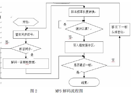 MP3采用了较为复杂的比特流结构,所有MPEG的比特流都被分割成了单独的帧。对于MPEG图2音频,每秒都传送固定数目的帧,也就是说,当比特率和采样率固定时,每一帧具有相同的大小,并携带有相同数目的样本。解码算法由嵌入式DSP软件实现,流程如图2所示。