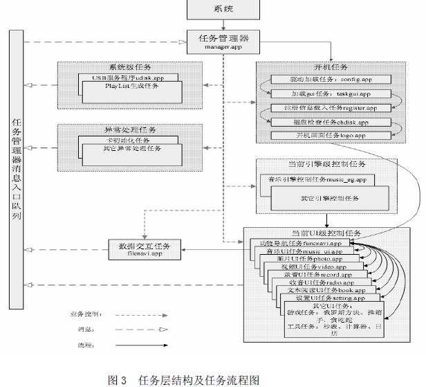 ATJ2135采用μCOS-Ⅱ操作系统进行软件移植设计。μCOS-Ⅱ是一个源代码公开的嵌入式实时操作系统,具有小内核、多任务、丰富的系统服务、容易使用等特点并且非常稳定、可靠。而由于其极小的内核,就特别适用于对程序代码存储空间要求极其敏感的嵌入式MP3应用系统开发。本系统采用可剥夺型多任务内核,其任务层设计及任务流程如图3所示。