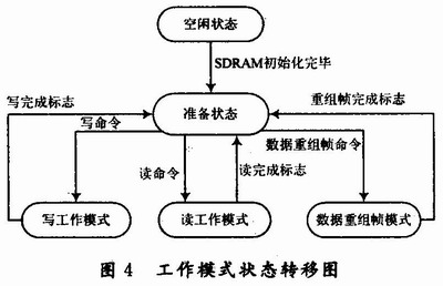 系统在空闲状态等待SDRAM初始化完成,当SDRAM完成初始化以后进入准备状态,表示系统可以接收命令,在收到写命令后进入写工作模式,低层写辅助控制模块激活,当完成写操作命令后产生一写完成标志信号,反馈回主控系统促使主控系统完成状态跳转回到准备状态等待下一次命令,收到读取命令后系统进入读工作模式,低层读辅助控制模块开始工作当完成读取操作后产生一读完成标志信号,反馈回主控系统使其回到准备状态等待命令,同样系统收到数据重组帧命令后进人数据重组帧模式,低层重组帧辅助控制模块开始工作完成重组帧任务后产生标志信号控制主控状态机再次回到准备状态,等待下一次命令。