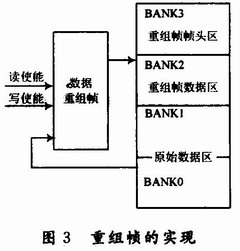 据,BANK3(BANK地址“11”)存储数据的帧头信息。系统在接收到数据重组帧命令后,按照要求抽取,帧数,帧长和帧间隔从低BANK区读取原始数据送入数据重组帧模块形成新的数据帧结构,然后将新的数据帧结构按照文件结构存储到高BANK区中。其实现框图如图3所示。