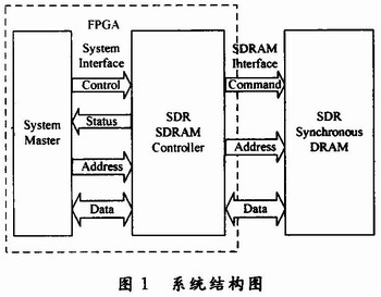 整个系统的设计以FPGA为核心控制器来组织工作,它由系统总控System Master与SDRAM驱动控制器SDRAM Controller组成。System Mas-ter接收高层控制指令,向SDRAM Controller发出命令,SDRAM Controller将命令翻译为底层SDRAM芯片的读写指令字精确控制其完成读写操作。系统主要解决的问题是基于文件结构的数据存储,数据重组帧和数据事后读取。系统整体框图如图1所示。
