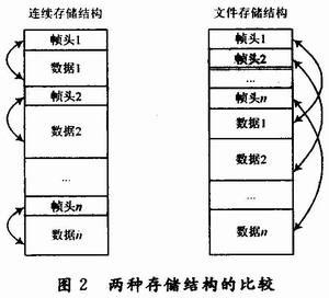 所谓文件结构指的是,将帧头与其所对应的数据分区存储,在存储时将存储数据的首地址添加到帧头信息中,在读出时,先读取帧头找到数据的首地址,然后加上系统给定的偏移地址算出读取的起始地址,从该地址开始顺序读取要求长度(小于等于帧长)的数据,在送往后端系统时更新帧头信息,后端系统收到数据无需做预处理直接进行计算即可。图2是2种存储结构的比较。