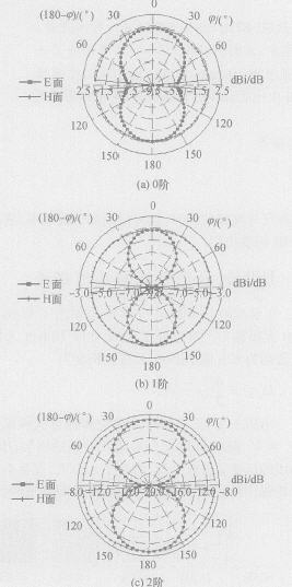 根据图1中的Hilbert分形结构,文中提出了如图2所示的二维Hilbert标签天线结构。 本文取Hil2bert标签天线外部等边长h = 54mm, 0阶Hilbert标签天线谐振频率为915MHz. 用矩量法对0~2阶的二维Hilbert标签天线进行仿真,结果如图3, 4 所图3 二维Hilbert分形标签天线的方向图仿真结果