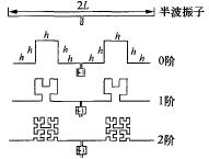 为了提高Hilbert分形结构的RFID标签天线的效率,本文提出了另一种形式的Hilbert标签天线结构,如图5所示。 谐振频率为915MHz的半波振子天线长度2L = 149mm. 取三等分弯折线,各弯折线段长度均为h = 2417mm,在弯折线部分采用Hilbert分形变换,弯折线天线为0阶Hilbert标签天线。