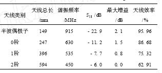 从图3和表1可以看出,相对于相同纵向长度的普通偶极子天线,随着分形阶数的增加, 0~2阶二维Hilbert标签天线的方向图基本保持不变,但谐振频率逐渐减小: 2阶二维Hilbert标签天线的谐振频率约为410MHz,若要保持谐振频率为915MHz,则2阶二维Hilbert标签天线的等边长度约为0. 46 h.